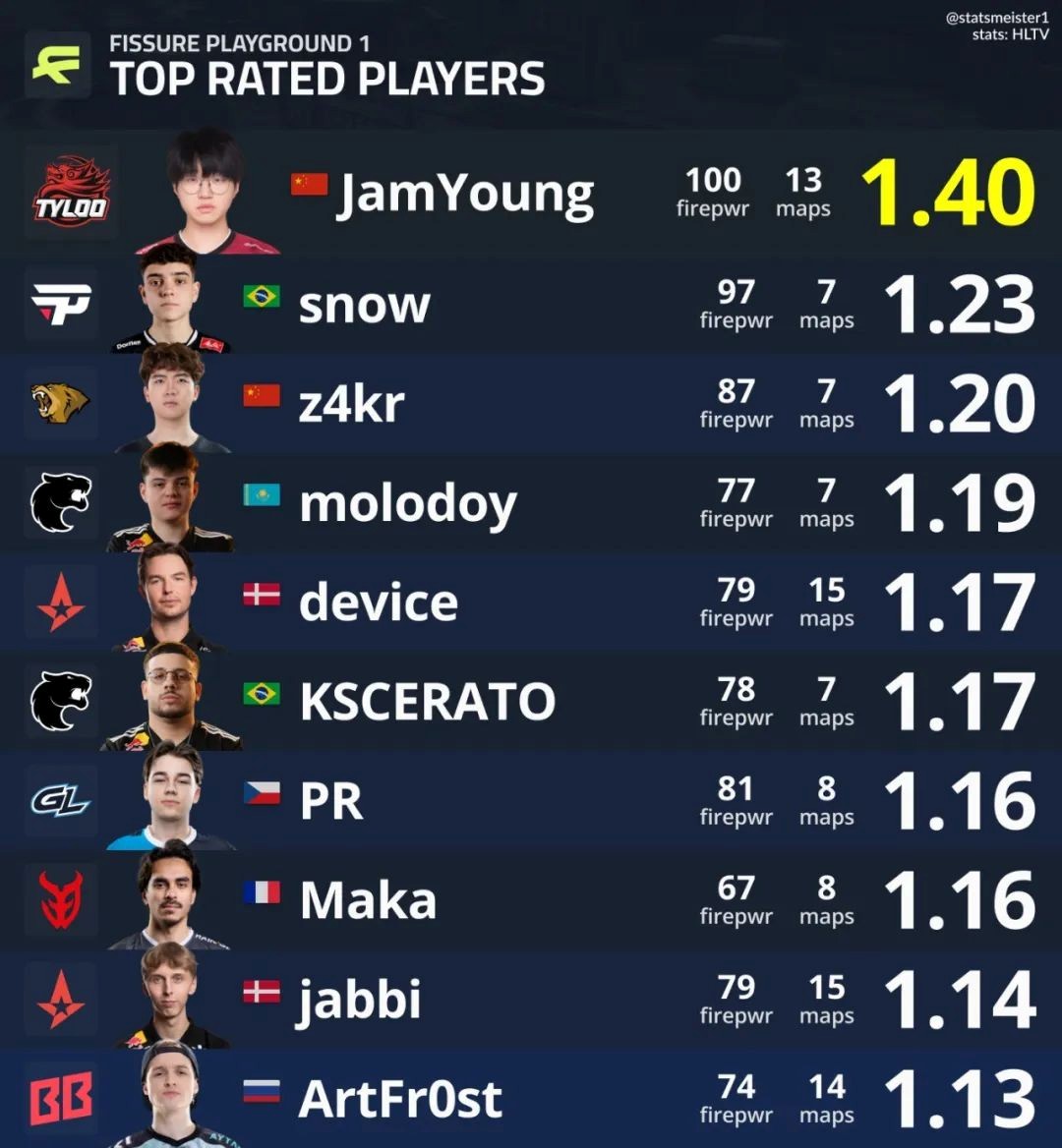 本届赛事,出战13张地图的TYLOO选手JamYoung,场均Rating高达1.40。如此豪华的数据,使得其成为HLTV评选的MVP。值得一提的是,这是首个由中国选手夺得的CS国际大赛MVP称号。放眼亚洲的话,此前也只有The MongolZ的狙击手910做到过。