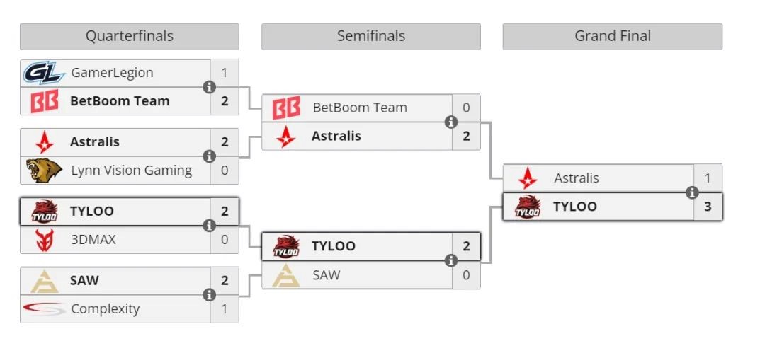 虽然最美好的结局没有出现,但CNCS已然创造历史。TYLOO在淘汰赛先在八进四斩落法国队伍3DMAX,后又在半决赛斩落葡萄牙队伍SAW,最终又在决赛阻止了丹麦队伍Astralis的复仇;以大场全胜的战绩夺冠。