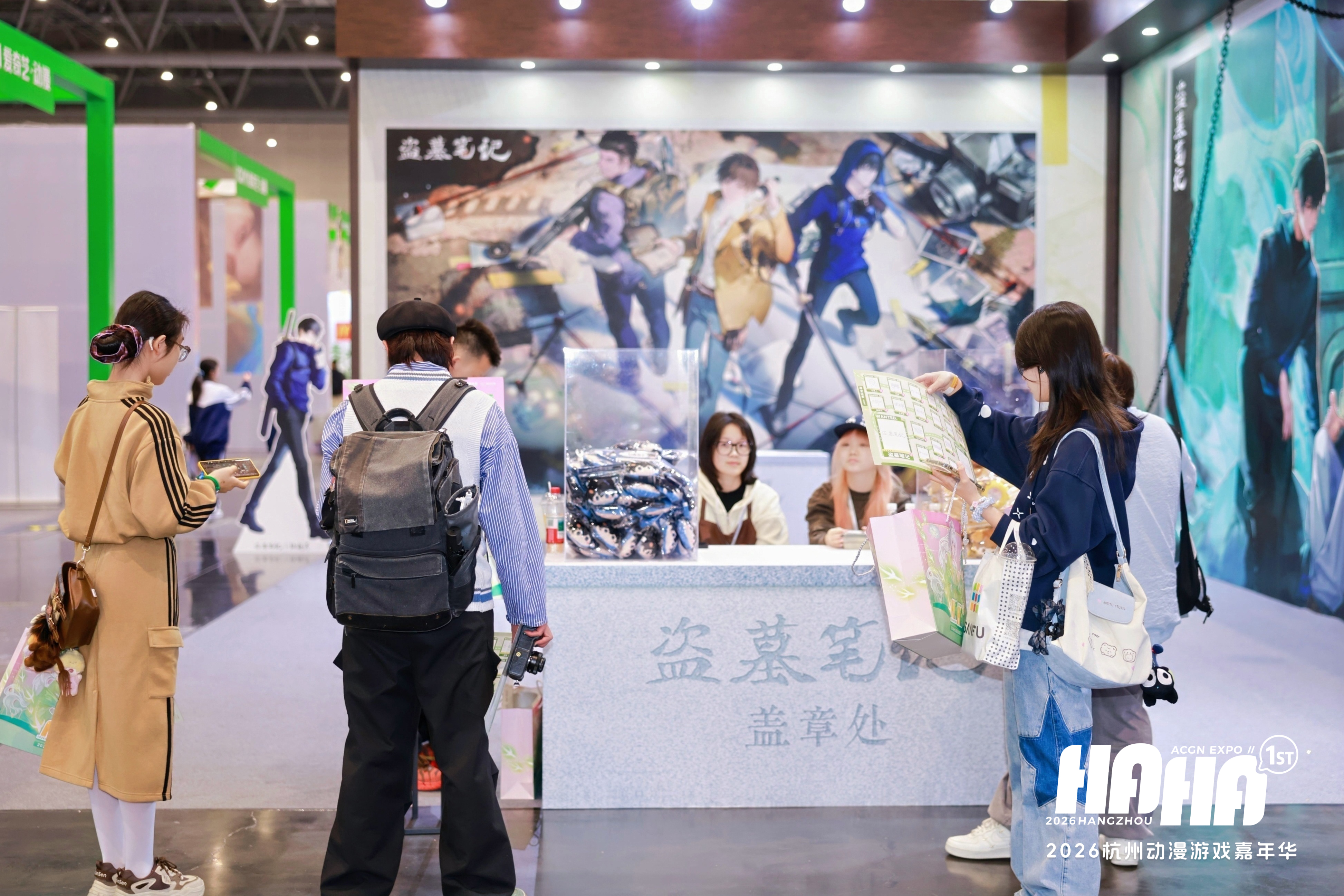 3号馆是核心的“品牌馆”,更是人气最旺的区域。不止于看,观众们还可以在这里“集邮”打卡,分享同人物料,购买周边与体验别具一格的互动游戏。记者在现场看到,《盗墓笔记》的“青铜门”前聚集了大量粉丝排队打卡;天闻角川特约店的书架前也围满了翻阅和购买画集的读者。爱奇艺动漫展台、九州燃漫的“九州萌屋”以及各大卡牌展商(如闪魂、Hitcard)的展位前都排起了体验和购买的队伍。与众不同的是,现场还特设了电竞专区,《第五人格》《王者荣耀》《剑网3》《天下》等热门游戏,都在现场开设区域,给观众提供独家线下试玩。中央的“HAHA次元盛典舞台”不时传来欢呼声,嘉宾活动正在热烈进行中。